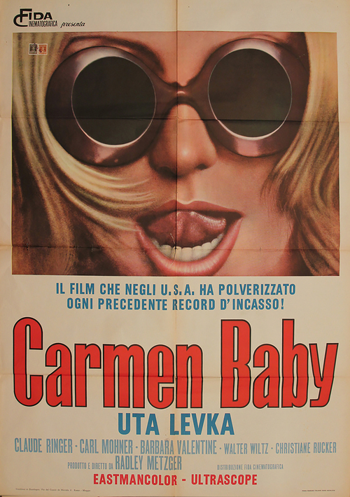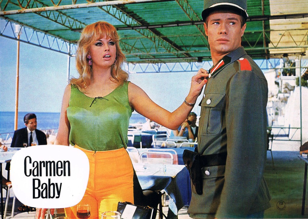 Faisons si vous le voulez bien un détour par l’Europe et plus précisément l’Allemagne et plus précisément la RFA. Oui, la Deutsche federal republik, la Germanie de l’ouest, celle du temps ou la terre tudesque était coupé en deux, celle du mur à Berlin, de la bande à Baader et du professeur Muller cher à Jean Pax Meffret. Quand leurs homologues de l’Est forniquaient sur commande, roulaient en Trabant et s’illustraient par des exploits sportifs douteux, les allemands de l’ouest quant à eux se gorgeaient des fruits de la croissance et apportaient leur contribution au cinéma d’exploitation. Outre les fameux « Krimis » et autres « Edgar Wallace », il y eut quelques égarés tel « La femme nue et Satan » ou encore « Le mort dans le filet », deux films ou apparaissait une jeune actrice autrichienne du nom de Ursula Ledersteger, plus connue en tant que Barbara Valentin. Elle squatta tout au long des années 60 l’exploitation teutonne, espionnage, drame olé olé, etc, elle fut bel et bien de la fête. Son opus maximum en la matière fut une version moderne de « Carmen », l’oeuvre de Mérimée devenant ici « Carmen baby », réalisée par l’américain Radley Metzger en 1967. Pour la petite histoire, le film faillit ne pas se faire, la poitrine de l’actrice ayant singulièrement augmenté suite à sa grossesse. Mais bon passons sur les problèmes pneumatiques si vous voulez bien.