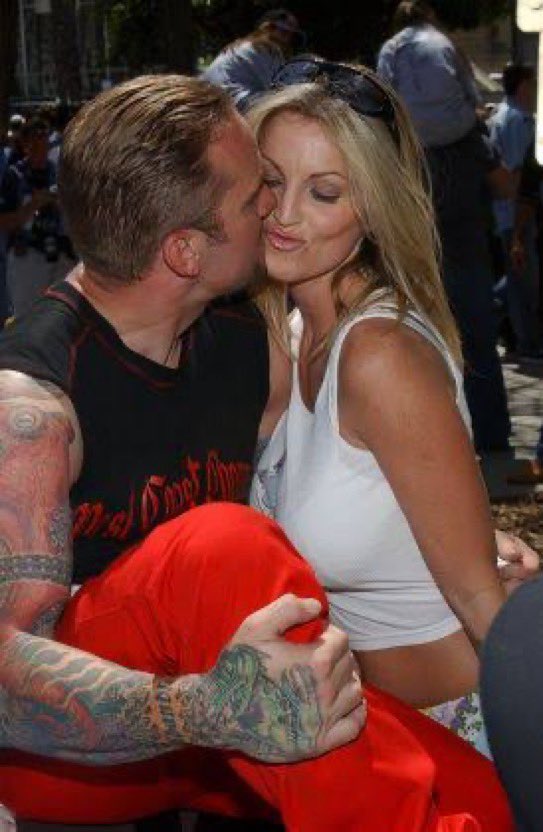 Janine, la seconde, se montra par contre plus maline. Elle se spécialisa dans le porno lesbien, contribuant à imposer piercing, faux seins et tatouages dans le monde du X. Elle trouva une gloire inespérée en posant pour la pochette (Voir image ci-dessous) de l’album du groupe Blink 182 « Enema of the state » (« Lavement d’état » en bon français) Elle y apparaissait en infirmière sexy (Ah bon?) enfilant, l’air gourmand, un gant en latex. Fatiguée, assez riche ou simplement soucieuse de sa famille, elle prit sa retraite au début des années 2000 avant de reprendre au milieu de la même décennie. Elle trouva entre temps moyen de faire parler d’elle en fréquentant Jesse James. Non, pas le célèbre hors la loi mais le mécano à la tête de « West coast choppers » Personnage un peu louche avec lequel Janine eut assez vite des rapports orageux.