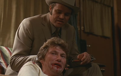 Mais le cowboy n’a pas cessé d’exister avec l’ouest mythique. Il a survécu et s’il n’a pas renoncé au cheval, il alterne avec le pick up ou la grosse Cadillac à calandre agressive. Ou le camion. Comme celui conduit par Burt Reynolds, contrebandier sympathique de « Cours après moi Shérif ». Mais, à encore certaines choses demeurent. Les vilains, par exemple. Le shérif jovial apprécié de tous qui cache un psychopathe meurtrier. C’est le portrait de Lou Ford, le policier décrit par Jim Thompson dans « Le démon dans ma peau »(Plus tard retitré « L’assassin qui est en moi ») . Le livre connut deux vies cinématographiques. L’une avec Stacy Keach qui jouait Ford dans « Ordure de flic » de Burt Kennedy (The killer inside me, Etats-unis, 1976) l’autre avec Casey Affleck dans… »The killer inside me » de Michael Winterbottom (Etats-unis, 2010) N’aynat vu aucun de ces films, je m’abstiendrais de tout commentaire. Néanmoins, il est permis de regretter que personne n’ai pensé à l’acteur qui aurait sans doute mieux que personne incarné le flic crée par Thompson: Charles Napier. Révélé par Russ Meyer dans « Harry Cherry and Raquel » (Voir photo ci-dessous) Napier y interprétait un shérif douteux, tueur à gages à ses heures pour un gros bonnet local. Pas un psychopathe mais il n’aurait pas déparé dans un roman de Thompson, étant un authentique fils du sud (Il naquit dans le Kentucky) avec accent intégré qui commença dans le Basket, continua dans les paras avant de se tourner vers la comédie. Sa mâchoire carrée et sa capacité à passer de la chaleur à l’agressivité en faisait un comédien hors-pair. Il apparut souvent à la télévision et grâce à…Alfred Hitchcock! Si ce dernier ne le fit jamais tourner pour lui, il favorisa ses engagements dans de nombreuses séries. Charles Napier joua enfin un psychopathe dans un autre opus de Russ Meyer « Supervixens » Il eut une carrière fournie et éclectique qui mériterait un article à elle seule et qui nous écarterait du sujet. Signalons quand même sa régularité chez Jonathan Demme (« Le silence des agneaux », notamment) son personnage de salopard bureaucrate dans « Rambo II » et un projet jamais réalisé et français qui plus est « Le troisième oeil » de Arnaud Sélignac ou Charles Napier aurait du faire face à Annie Girardot! Nom d’un petit bonhomme, cela aurait eu sacrément de la gueule!