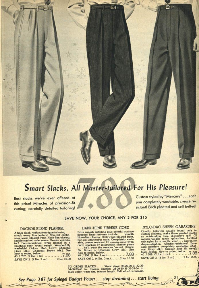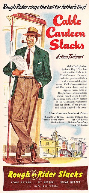 Le bonheur se porte large, le pantalon aussi parfois. C’était le cas au milieu du XXè siècle, en gros des années 30 à la fin des années 50. Etait-ce parce que subsistait alors cette croyance selon laquelle « plus le pantalon est large, plus l’homme est fort? » Mystère. En tous cas, le pantalon se portait large. C’était la mode, certains diront la norme. Parfois, il devenait l’uniforme du rebelle, dépassant la mesure et attirant les foudres des autorités chez Cab Calloway et ses admirateurs zazous ou se resserrant aux chevilles, signe de ralliement des suiveurs du King. Eddie Cochran les immortalisa le temps d’une chanson « Pink peg slacks ». Car, oui l’objet se parait à l’occasion de vives couleurs.