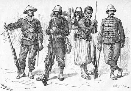 Fait de liège et inspiré par le Salakot, ou chapeau conique des paysans du Vietnam, le casque colonial protégeait des intempéries et – surtout- du soleil bien plus que des balles. Il devint vite l’emblème de nos troupes stationnées outre-mer, des pères blancs ainsi que des civils qui s’y étaient installés. Il fut décliné en diversement, haut et pointu chez les anglais, large et arrondi chez nous les français, étroit et bombé chez les allemands. Sans compter on port par la célèbre expédition SS au Tibet qui inspira « Les aventuriers de l’arche perdue » Les russes en eurent leur propre version qui ne fut prisée que par leurs premiers aviateurs. De l’autre côté de l’Atlantique, la cavalerie puis les Marines l’adoptèrent.Il fut récupéré par les vietcongs, notamment ceux qui reçurent la pitre gauchiste Jane Fonda lors de sa complaisante visite à Hanoi. De nombreuses personnalités l’arborèrent, tel De Gaulle. La culture populaire s’en empara. La bande dessinée avec Tintin, ou le Major Fatal de Moebius, le cinéma ou il apparut dans « L’homme qui voulut être roi » ou « Mort sur le Nil » et même « Subway » la fantaisie suburbaine peu inspirée de Luc Besson. On n’oubliera pas non plus la Pop avec Madness dont les membres se déguisèrent en figurants de « Mort sur le Nil » le temps du clip de « Night boat to Cairo »
