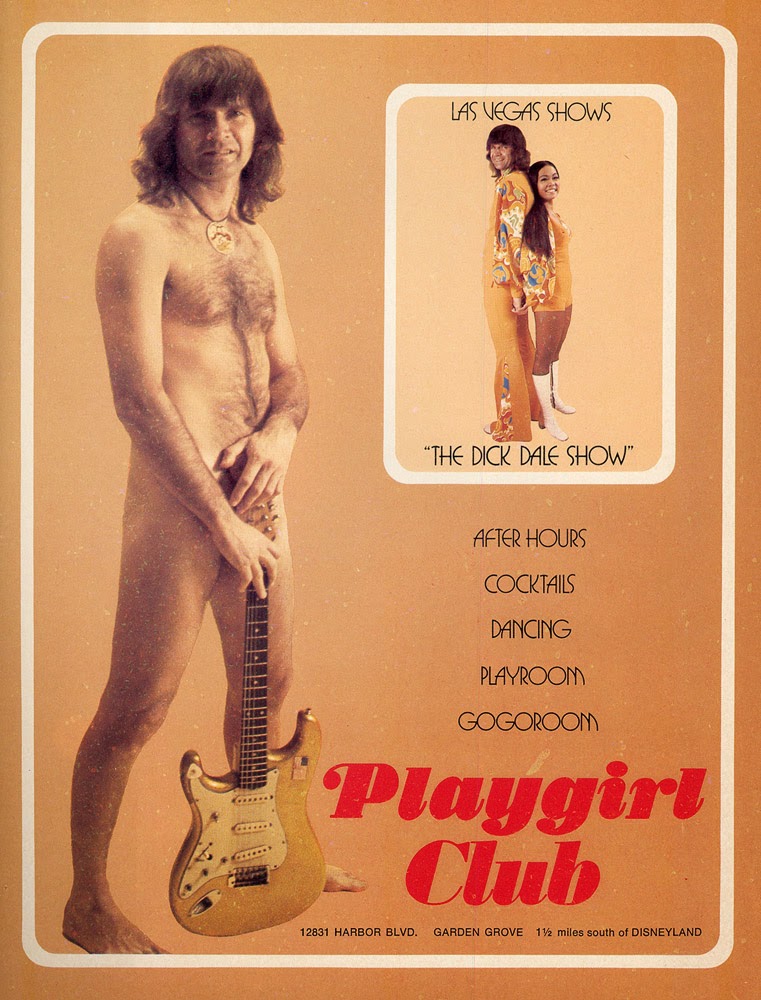 Une photo clin d’oeil pour plaire à mesdames qui se plaignent du trop grand nombre de femmes nues! Alors heureuses? Pour information, cette photo était comme indiqué ci-dessous l’affiche d’un spectacle que donnait Dick Dale au « Playgirl club » (Le Playboy club, mais pour les dames) à Las Vegas en 1973. L’histoire ne donne pas le pourquoi, sans doute parce que Dale était athlétique?