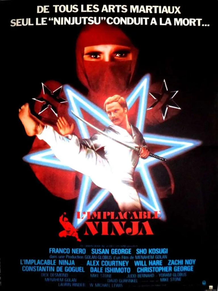 1980…Ou l’heure des ninjas en Occident. Chuck Norris les affrontait dans « La fureur du juste », Eric Van Lustbader faisait sa fortune avec son « Ninja » en librairie. Oui, c’était l’heure de gloire de ces guerriers du Japon médiéval à la fois espions, assassins et maîtres du déguisement qui infiltraient les lignes ennemies en portant l’uniforme de l’adversaire (Préfigurant en cela la division de l’Abwher Brandebourg, mais c’est un autre sujet) et allumaient des incendies – leur spécialité. Bref ces hommes de guerre et de renseignement ne pouvaient qu’intéresser le cinéma par leur légende. Cela avait déjà été le cas au Japon ou, au sein du film d’arts martiaux local, le ninja devint un thème de prédilection au point de créer un sous-genre. Quelques oeuvres devinrent des classiques dans leur catégorie tel « Shinobi no mono » de Satsuo Yamamoto (1962) ou encore » Samurai spy » de Masahiro Shinoda (1965)Mais il s’agissait de films sérieux. Quoiqu’il en soit, Le terrain était bon . Et le mélange de flair et de culot de Golan/Globus n’ayant pas de limite, un film de ninja sembla à celui-ci une bonne affaire. Recrutant Franco Nero -qui ne connaissait rien à l’art du Ninjutsu- et Sho Kosugi -authentique artiste martial- pour donner naissance à « Enter the Ninja/L’implacable ninja »réalisé par Golan en personne. Ainsi naquit le film de ninja occidental, ou plus précisément du ninja blanc…