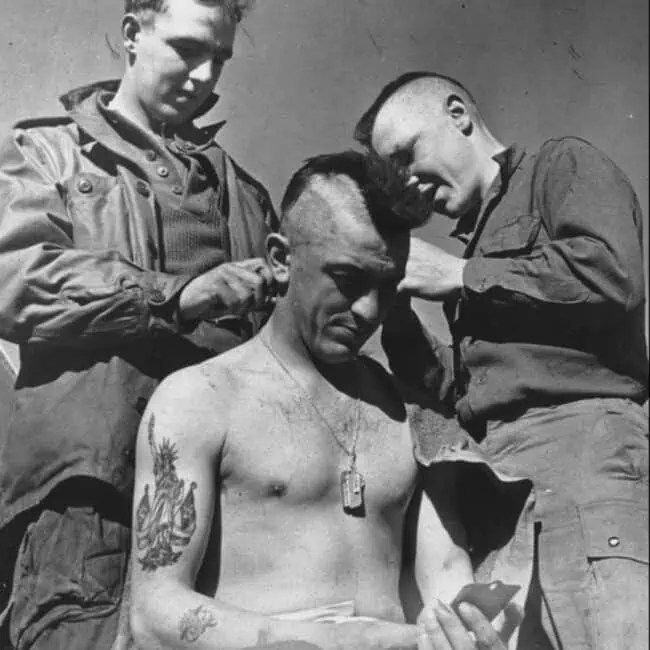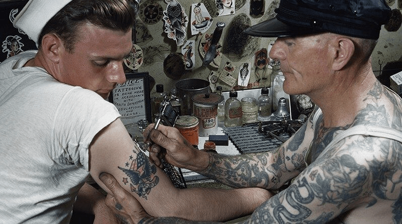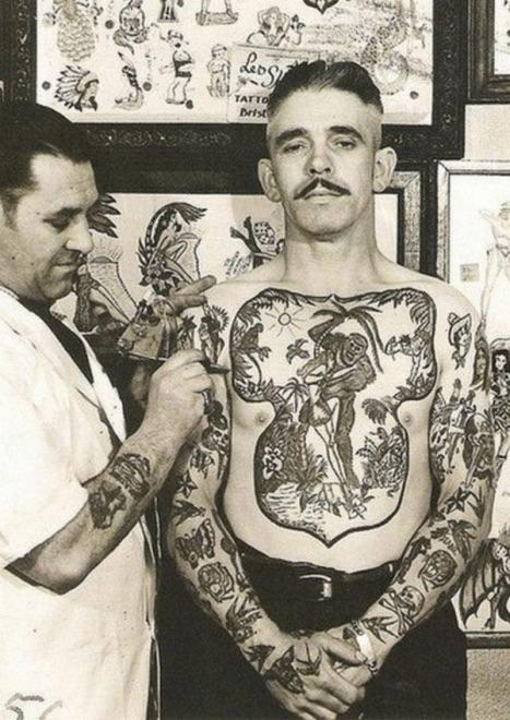 Les Skuse, mythique tatoueur britannique et un client marin portant des palmiers désignant dans la marine de sa Majesté les hommes de mer ayant traversé la Méditerranée, dans la marine américaine ceux ayant été stationné à Hawaii.