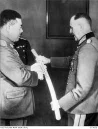 Cependant, des relations diplomatiques courtoises s’étaient établie entre les deux pays. Des dignitaires, militaires ou non, s’échangeaient des décorations à titre honorifique. Ainsi Keitel, Goering, Himmler se virent remis de prestigieuses distinctions. Et ce n’était pas à sens unique. Yamashita, d’ailleurs surnommé le « Rommel » japonais eut droit à une médaille teutonne. Hitler en personne se vit proposer une décoration de la part du Japon impérial qu’il refusa, fidèle en cela à son principe consistant à n’accepter aucune décoration étrangère. En revanche, il accueillit avec plaisir un katana, lequel fut perdu au moment de la défaite du Reich et jamais retrouvé. Ce qui en fait l’artefact lié à la Seconde guerre mondiale le plus cher au monde. L’Italie ne fut pas non plus en reste, Mussolini ayant eut comme don de l’ambassadeur du Mikado à Rome une armure samourai. A ce propos, le génial dessinateur et néanmoins fasciste fanatique Gino Boccasile se fendit d’une affiche de propagande en faveur de l’Empire du soleil levant peu après…Pearl Harbor!