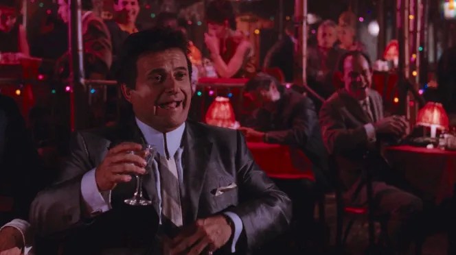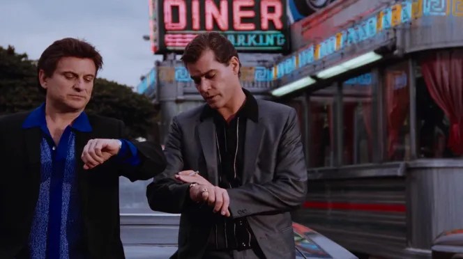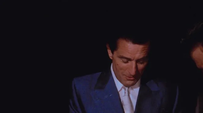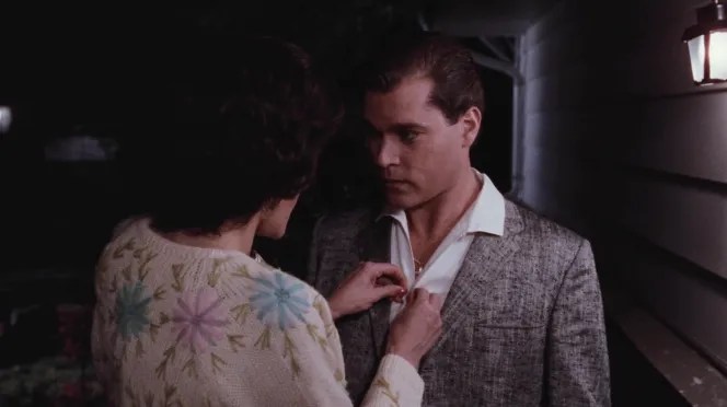 Comme souvent chez Scorsese, les vêtements jouent un rôle majeur dans le récit et la mise en scène, tel ce truand ( voir phot ci-dessous) qui rejoint ses confrères réunis autour de spiritueux dans une arrière-cour sous le regard d’Henry camouflé derrière les stores de sa chambre d’adolescent. » Aussi loin que je me souvienne, j’ai toujours voulu être un gangster, ils avaient le pouvoir, ils avaient l’argent.. » Déclare-t-il en voix off, donnant le ton du film qui sans faire l’apologie du crime ne néglige pas la fascination qu’il exerce.