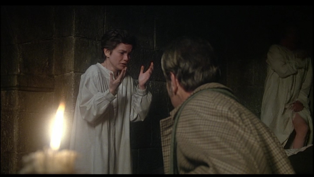 L’une des plus « populaires » fut celle du royal assassin, du chirurgien mandaté par la Reine en personne pour créer un écran de fumée autour d’une liaison aux airs de mésalliance entre une roturière et le prince héritier. Si « Meurtre par décret » n’est pas le premier film confrontant le limier de Baker Street et le tueur de Whitechapel (James Hill l’avait fait quelques dix ans plus tôt dans.. » Sherlock Holmes contre Jack l’éventreur »), il est sans doute le premier – du moins à ma connaissance- à prôner cette théorie incriminant les Windsor. Subtilement, il est vrai, car il profite des possibilités offertes par le sujet et son contexte – l’ère Victorienne- pour évoquer le sort des femmes ‘alors et caser ainsi un discours féministe typique de l’époque ou le film fut tourné. Mais sans excès, toutefois. Il est cependant intéressant de signaler à ce propos que les films d’époque, en l’espèce le XIXème siècle, parlent surtout de leur époque. Le personnage de Holmes subit ce lessivage, humanisé, socialement concerné et par moments fragile, dans les limites du raisonnable cependant. Point de dépendance à la drogue donc contrairement au film de Herbert Ross précédemment chroniqué.