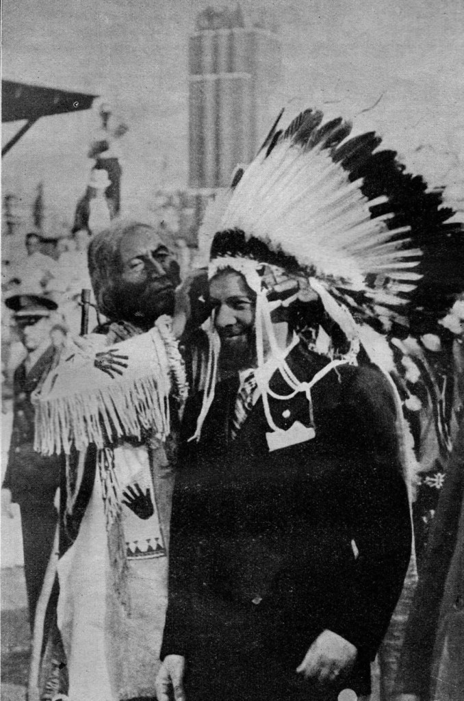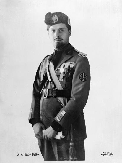 Au commencement, il était socialiste, en tout cas républicain et fut même au passage franc-maçon. La guerre, la Grande ou il fut fantassin puis aviateur, le prépara à rejoindre une autre troupe, celle du Fascisme et de son chef: Mussolini. Terreur des rouges dont il incendiait les maisons. Il participa à la colonisation de la Lybie ou il créa un équivalent musulman du parti fasciste. Il devint le ministre de l’air du régime et gagna une popularité qui dépassa les frontières de l’Italie, comme le prouva sa triomphale tournée aux Etats-unis qui lui valut d’être nommé chef par une tribu indienne (Voir photo) Il mourut retour de Tobrouk, sans qu’on sache si c’était le fait d’un « tir ami » ou d’une volonté du Duce qui lui reprochait son opposition à la guerre et à l’alliance avec l’Allemagne.