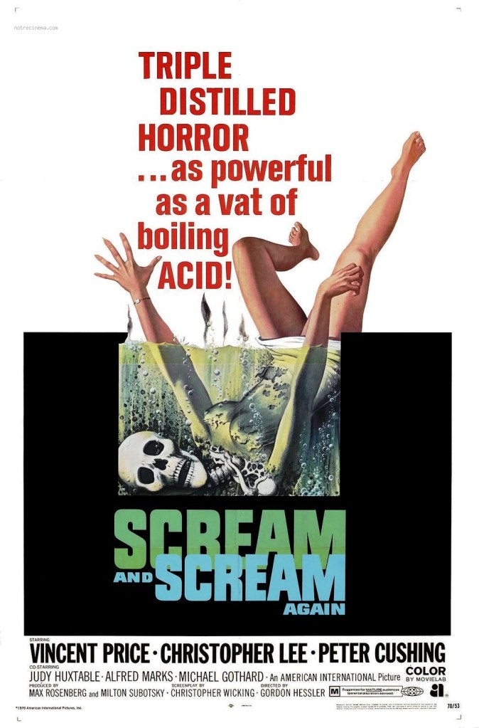 Les incursions en Angleterre de Vincent Price lui permirent de rencontrer ses pairs locaux, à savoir Christopher Lee et Peter Cushing, notamment dans « Lâchez les monstres/Scream and scream again » de Gordon Hessler (1969) variation maline mêlant transpantation et néo-fascisme sur le thème de Frankenstein. Hélas les trois acteurs ne partagent ici aucune scène.