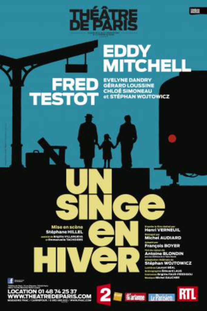 Il y a cela et bien d’autres choses dans « Un singe en hiver » qu’il était bien difficile à priori de rendre à l’écran. Aussi faut-il saluer le tour de force de Henri Verneuil quant il s’est agi de donner une vie cinématographique au livre d’Antoine Blondin. Voila. Rien à ajouter sinon que je recommande le livre- si vous ne l’avez pas déjà lu. Et je vous offre en prime l’affiche de l’adaptation théâtrale (Dont j’ai découvert l’existence au gré de mes recherches) avec Fred Testot et Eddy Mitchell!