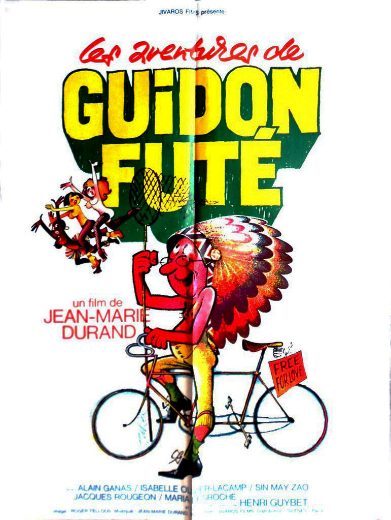 Croyez le ou non, mais je n’ai lu aucune critique fut-elle négative des « Aventures de Guidon futé », film maudit en un sens car réalisé en 1978 – ou 1979, c’est selon- il ne sortit qu’en avril 1980. Et ne tint l’affiche que bien peu de temps en dépit des efforts des publicitaires qui en changèrent le titre. Ainsi, cette comédie passa du peau rouge cycliste au Bardot masculin en devenant « Sois beau et tais toi ». Il existerait paraît-il un autre titre alternatif « Tais toi et mange ta soupe » Deux labels qui trahissaient à la vérité le contenu. Car il ne s’agit nullement ici de la beauté du ‘héros » et encore moins d’une injonction à manger une soupe, du genre que celle qu’on adresse à un enfant capricieux. Non, là il est question d’un adulte, certes immature, mais physiquement achevé. Il suffit pour s’en convaincre de voir ses nombreuses aventures. Par ailleurs, il circule bien à vélo -un tandem, qui plus est- et se montre déguisé en indien de carnaval lors d’un spectacle forain. Bon, mais à part ça? Eh bien pas grand chose. Même pas les moments de délire qu’on trouvait dans les bandes ou figuraient Lefebvre et compagnie. C’est pour cela, ainsi que je le disais en introduction, que « Les aventures… » relèvent de la plèbe de la comédie bas de gamme et ce malgré la présence d’un ténor du genre au générique Henri Guybet (Au demeurant excellent acteur). A tel point que Jean Marie Durand, le réalisateur, se limita à cet opus dans le cinéma normal, le reste de sa carrière derrière la caméra étant consacrée au porno. Il occupa par ailleurs divers postes allant de la production à la comédie, pour des films aussi divers que « Les granges brûlées » « Je ne sais rien mais je dirais tout » ou « La vampire nue »