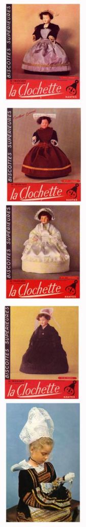 Voici la fin de ce tour d’horizon. En guise de conclusion, un coup de chapeau à Marie-Anne Le Minor, créatrice des poupées du même nom. La marque lancée en 1936 à Pont L’Abbé dans le Finistère, favorisant ainsi l’emploi dans cette région. Offerte dans les années 50 lors des vols d’Air France à destination des Etats Unis, Caroline Kennedy fut d’ailleurs une des heureuses bénéficiaires du jouet breton. Dotée d’un solide esprit d’entreprise et du sens des affaires, Marie Anne Le Minor initia un partenariat avec les biscottes la Clochette qui offrait un buvard publicitaire des poupées dans ses paquets. Bon, la prochaine fois je vous parlerai des biscottes Bougard chères à mon grand-père. Mais ça c’est une autre histoire!