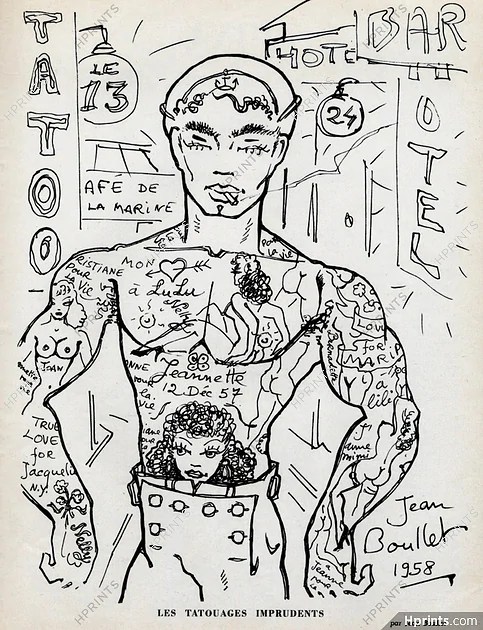 Hommage à Bruno Cuzzicoli alias Bruno de Pigalle, pionnier français du tatouage (Il fut d’ailleurs le premier dans son genre à être reconnu officiellement par l’état) et à un des plus fervents adeptes du dessin sur peau: le peintre et thuriféraire du fantastique Jean Boullet!