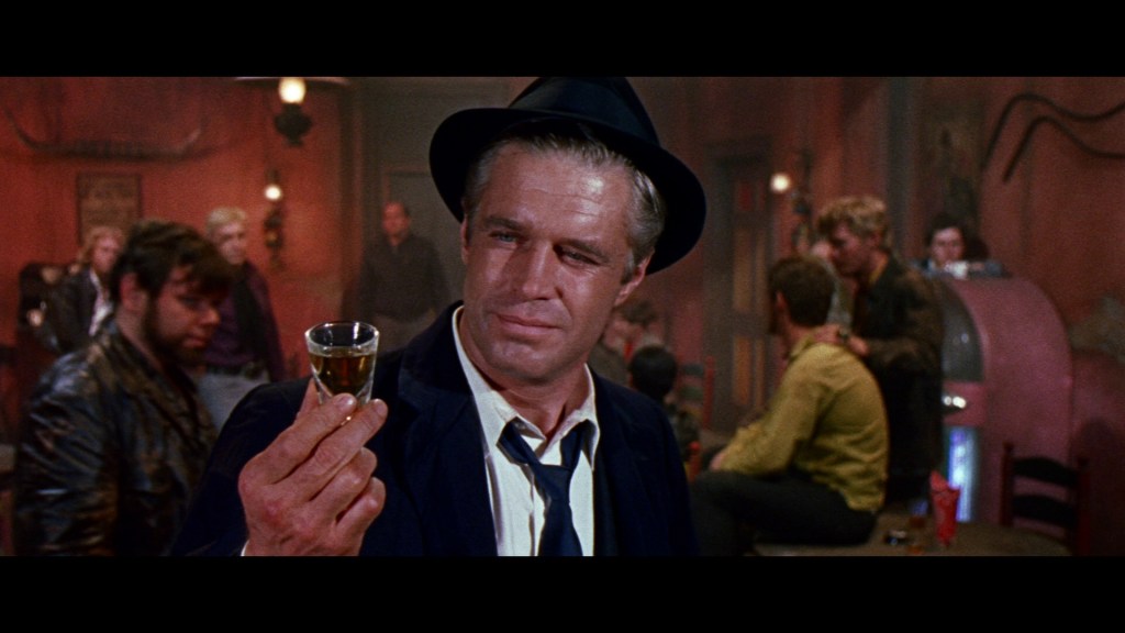 George Peppard dans le rôle du privé malchanceux et ancien Marine « P.J/Syndicat du meurtre » de John Guillermin (1968) Ici, il prend un verre dans un débit de boissons réservé aux messieurs. Le calme avant le passage à tabac.