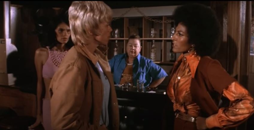 Autre Blaxploitation, avec cette fois l’une de ses plus grandes stars, Pam Grier qui donne des leçons de marave à une lesbienne dans « Foxy Brown » de Jack Hill (1974) « Je suis ceinture noire Karaté » ‘Je suis ceinture noire de tabouret de bar » A noter que les méchantes blanches dans les Blaxploitation collaient souvent les timbres. Pa très intersectionnel tout ça!