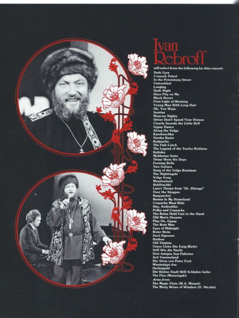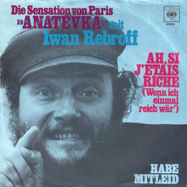 Les plus âgés d’entre vous se souviennent peut-être de celui que d’aucuns surnommèrent le « Russe Folies Bergères » autrement dit Ivan Rebrov. Il était à l’origine chanteur d’Opéra, allemand et né Hans Rolf Rippert en 1931. Célèbre pour avoir chanté le répertoire traditionnel russe en plaine guerre froide ainsi que de nombreux thèmes populaires issus de la variété ou de la comédie musicale, le plus célèbre étant « Ah si j’étais riche/ If I were a rich man » extrait du célèbre « Un violon sur le toit/A fiddler on the roof » (Après Zero Mostel, Chaim Topol et avant Paul Michael Glaser, eh oui, Starsky en personne!)