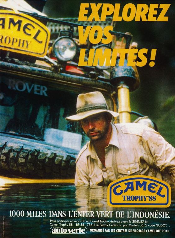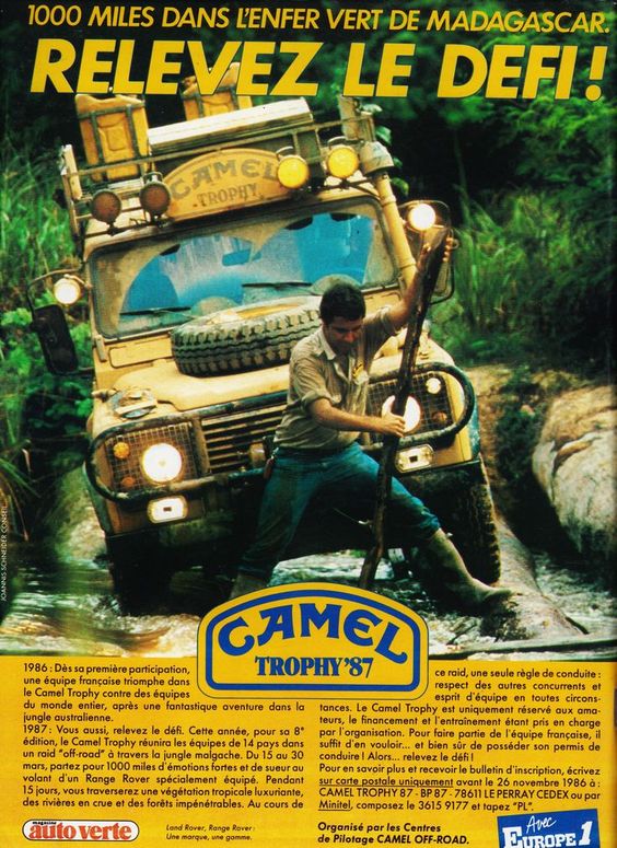 Initié en 1980, le Camel Trophy proposait de l’aventure à la carte à qui voulait y participer. Ainsi, le cadre sup (On ne disait pas encore CSP+) avit l’occasion de perdre du gras autrement qu’à la salle de muscu. Qu’on me pardonne mon incompétence, mais j’ignore quand s’arrêta le Trophy mais il semble qu’il n’ait pas survécu aux années 80 dont il était un des aspects iconiques. Il serait probablement impossible, ou à tout le moins très difficile, de rééditer un pareil concours qui serait vu comme une vile manifestation du masculinisme (Sandrine Rousseau, sors de ce corps!) C’est vrai, sur ses publicités on voyait des hommes qui n’étaient pas déconstruits et qui ressemblaient à des hommes. C’est vrai qu’une marque de cigarettes finançait la chose et que le tabac c’est pas bon pour la santé. De nos jours n’importe quel petit merdeux est incapable de faire une phrase sans faute de grammaire mais sait vous rappeler à que c’est pas bien de fumer s’il vous surprend clope au bec. C’est vrai enfin que les grosses Range Rover emblèmes de la course et fabriquées soit dit en passant au Brésil consommaient de l’essence et polluaient, c’étaient pas le bus au colza de Bayrou ou les voiturettes électriques pour neuneus et alcoolos virés du permis que voudraient voir se multiplier les écologistes. Mais c’est l’image d’un temps ou totu n’était pas interdit. Alors, merde, buvons, fumons, roulons vite et baisons sans capote!
