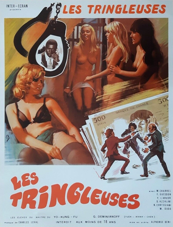 Après l’Italie, voyons par chez nous, la France. La France en effet n’échappa pas à cette vogue. L’autoproclamé « Maître incontesté de l’érotisme » José Benazeraf s’y intéressa avec son « Black love » également intitulé « L’homme qui voulait violer le monde » (!) Comme l’italien Cavallone, Bénazeraf balance une sauce mélangeant sexe et politique mais sans les excès parfois réjouissants du transalpin. Non, ici, on a droit à du lourd et du pompeux, du cul, oui, mais du cul qui PENSE! Benazeraf, le Don Patillo de la fesse, un label de qualité. Pour peu qu’on aime l’ennui mortel. Oui, mais qu’est-ce que ça raconte Alexandre? Ah, oui c’est vrai, ça raconte quelque chose. Un membre des Black panthers détourne l’argent de son parti et va se soulager dans les coins. Bien entendu, des tueurs, pardon des sicaires, le traquent. A part ça? A part ça rien! Sinon la présence d’Alphone Beni dans le rôle principal – lequel se fâcha d’ailleurs avec Benazeraf. Soit, mais qui est, enfin qui était Alphonse Beni (Il nous a quitté l’année dernière) Ni plus ni moins que le pionnier du cinéma camerounais et l’un des rares à ne pas avoir été financé par l’état, ce qui lui permit d’éviter le ton documentaire coutumier au cinéma de son pays. Après quelques courts métrages réalisés entre la fin des années 60 et le début des années 70, engagés malgré tout ( « Un enfant noir » entre autres) il passa ensuite à ce qui l’intéressait vraiment: les films de genre, calqués sur le modèle occidental. Et bénéficiant souvent de fonds français. En vertu de cette configuration, la carrière de Beni fut pendant longtemps un va et vient entre la France et le Cameroun. Cela lui valut d’apparaître dans quelques productions fauchées des mythiques firmes « Eurociné » (« Les hommes de joie » « Godefinger » avec Michel Leeb) et « Comptoir français du film ». Il mit en scène dans ce contexte « Les tringleuses » (1975)