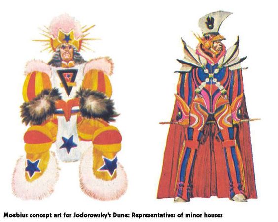 « Nom d’un petit bonhomme! » Dut-il s’exclamer à la fin de sa vivifiante lecture, « Ah ça, ça va nous donner un p….n de bon film, un chef d’oeuvre, un monument qui va révolutionner non seulement le cinéma mais aussi la vie elle-même » Alors, ni une, ni deux, il s’empressa de payer les droits du bouquin, aidé par un jeune producteur au nom de primate Jean Paul Gibon. Il rameuta par la suite son compère le dessinateur Moebius qui conçut l’allure des personnages, avant de se mettre en quête d’autres collaborateurs tels le peintre suisse H.R Giger, l’illustrateur anglais Chistopher Foss, le scénariste américain Dan O’Bannon (Qui, à l’instar de Giger travaillera sur « Alien ») Et bien sûr, il alla faire le trottoir auprès du gratin du cinoche international, de Alain Delon à Orson Welles, de Charlotte Rampling à Hervé Villechaize, en passant par Udo Kier etle scarabée en personne David Carradine. Notre brave Jodo, convoqua même des personnalités pour partie étrangères au monde du grand écran, ou récemment révélés, en l’occurrence Salvador Dali, devenu encore plus célèbre depuis qu’il avait déclaré dans une publicité son amour du chocolat praliné de Lanvin, ainsi que Mick Jagger, remis de ses aventures en kimono et rouge à lèvres de « Perfomance » et de son seau sur la tête de « Ned Kelly »