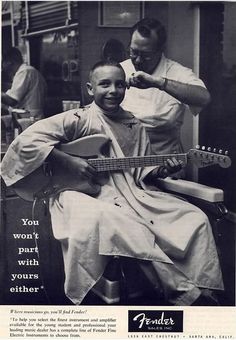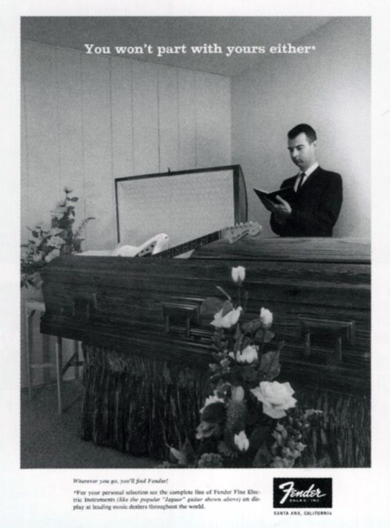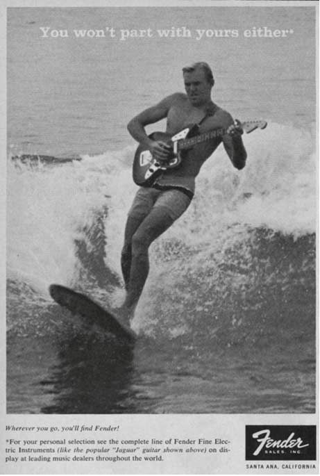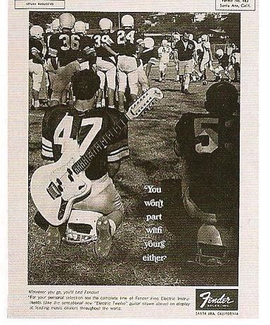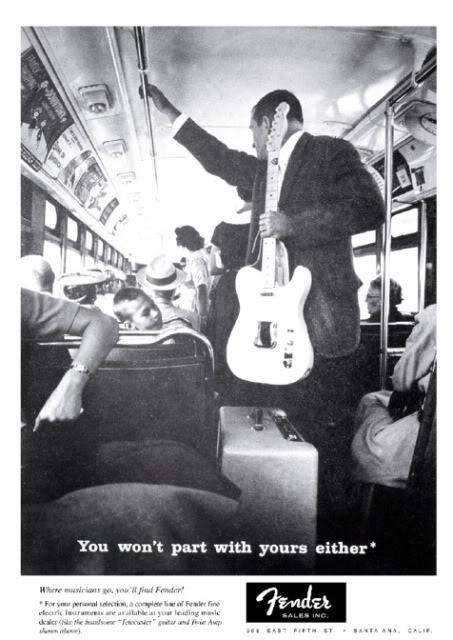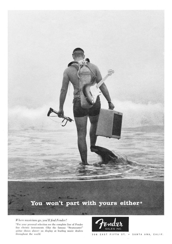 Une page de publicité musicale! Vous aimez les publicités? Vous aimez les guitares? Alors cet article est fait pour vous puisqu’il traite de publicités pour des guitares, pas n’importe lesquelles: les Fender!
