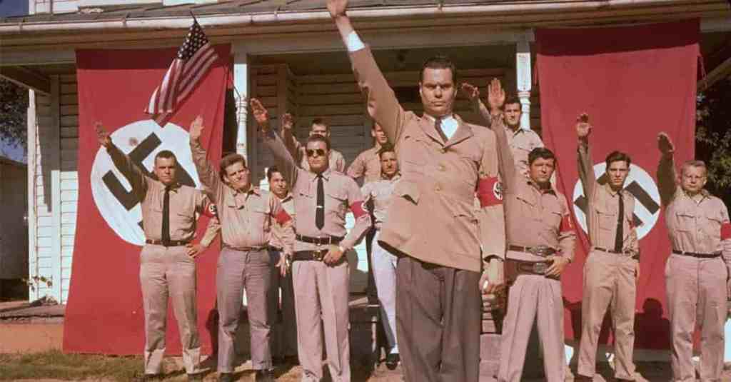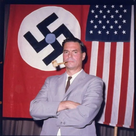 A la fin des années 50, un certain George Lincoln Rockwell, publicitaire et ancien pilote de l’Aéronavale, créa le Parti Nazi Américain, en contradiction totale avec son passé. Aviateur sans reproche qui combattit l’Allemagne nazie durant la seconde guerre mondiale, avant de faire à nouveau son devoir en Corée, ce fut une fois rendu à la vie civile qu’on ne sait quelle mouche piqua Rockwell pour que ce dernier s’entiche du Fuhrer. Peut-être avait-il entendu une voix qui lui aurait dit, tel à un Mahomet d’Outre-Atlantique: « Admire Adolf, t’auras l’air d’un coureur! » Mais quelle que fut la raison de ce revirement, Rockwell s’y tint, créanr le Parti Nazi Américain, lançant le slogan « White Power » et malgré son peu d’audience, Rockwell suscita un intérêt qui dépassa et dépasse encore la question de l’aspect folklorique du personnage et de son mouvement.