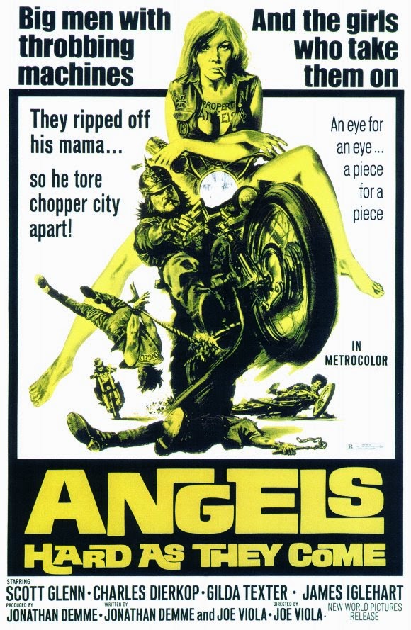 Je placerais cet article sous le patronage de Gilda Texter, rendue à jamais célèbre pour son rôle de motarde dénudée dans « Point limite zéro » (1971) qui lui ouvrit les portes d’une carrière dans le cinéma d’exploitation, notamment dans le Bikesploitation « Angels hard as they come »dont l’affiche figure ci-dessous! Notons que l’accorte dame termina en costumière, notamment sur « A la poursuite du diamant vert », un comble pour quelqu’un qui s’était fait connaître pour être apparue dans le plus simple appareil!