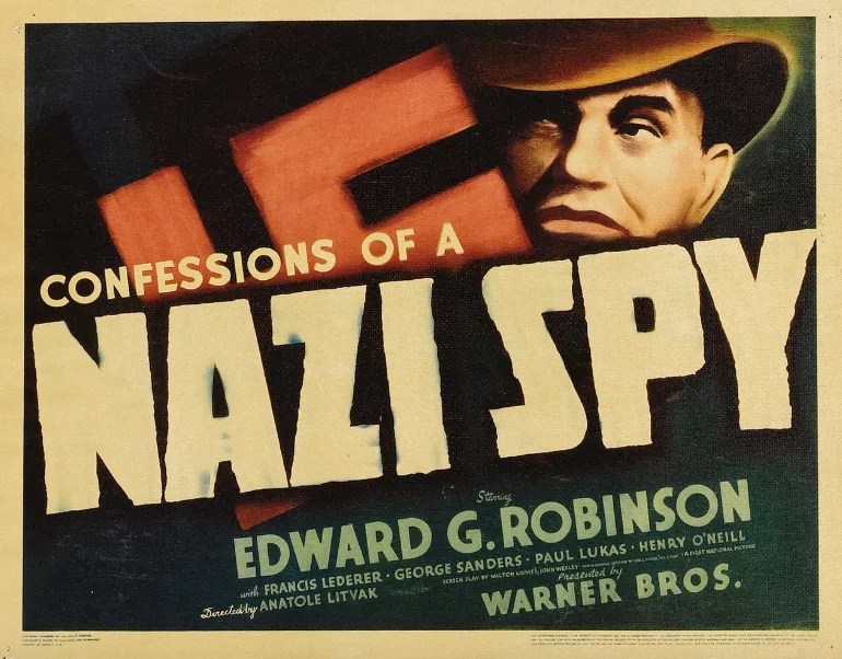 Hollywood perdant rarement du temps pour s’emparer de l’actualité (Il faut battre le fer tant qu’il est chaud, c’est bien connu!), un film consacré aux nazis américains fut tourné dès 1938 par Anatle Litvak: « Confessions of a nazi spy/ Confessions d’un espion nazi. »