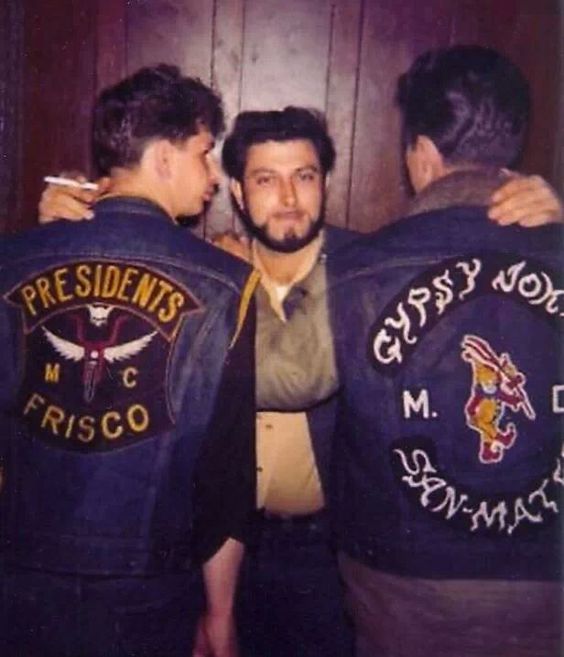 De dos à gauche, un membre des Gypsy Jokers, bande rivale des Hell’s angels, qui fusionna avec ces derniers suite à a défaite, relatée par Hunter Thompson dans son livre justement nommé ‘Hell’s angels »