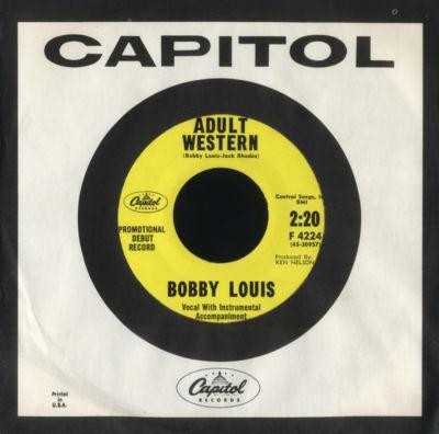 Ce n’est pas Bobby Darin, ni Bobby Rydell, mais Bobby Louis. A la vérité, on ne sait pas grand chose de ce chanteur qui laissa deux 45 tours en 1959: « Cell of love/ I’m a coaward » et surtout »Love at first sight/ Adult western » En l’occurrence, c’est le deuxième qui nous intéresse et plus particulièrement sa face B (Comme quoi, il ne faut pas négliger les face B, certaines ont dépassé les face A), un Rock’n’Roll au titre singulier « Adult western » aux paroles à double sens qui démarre doucement et tourne frénétique.