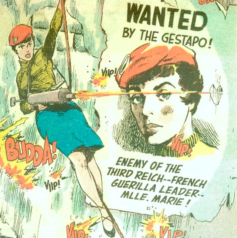 Mademoiselle Marie et G.I Joe, séductrice faisant honneur à la réputation de séductrice de la femme française, sous le regard peut être jaloux de Sergent Rock, autre personnage issu de la bande dessinée!