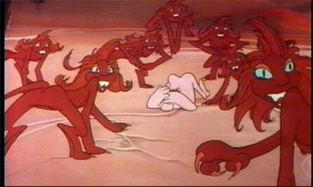 Mais le plus important, c’est le passage ou le héros perd sa virginité avec le membre d’une tribu de créatures mi-femmes mi-chats (Je ne vais pas écrire chattes!) ce qui techniquement, équivaut à une découverte de l’amour à des fins autres que reproductrices. Bref, il prend son pied.