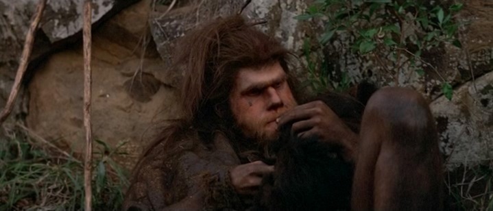 Bon, ça suffit la pommade, venons en à l’essentiel. L’histoire est celle d’une tribu qui, privée de feu, envoie quatre de ses braves en chercher le secret (Parmi eux, on trouve Ron Perlman, pas encore Biker en chef dans « Sons of Anarchy) Chemin faisant ils rencontrent toutes sortes de peuples et d’animaux bizarres.. Enfin, vous le savez déjà, alors j’abrège. Car le vrai, le seul, le grand moment est celui ou la petite troupe rencontre une tribu lacustre. Une vilaine blessure et une jolie membre de ladite tribu vaudront au chef de la troupe de velus une fellation pratiquée par ladite indigène (Rae Dawn Chong, fille du comique Tommy Chong, membre duo lamentable « Cheech & Chong », vous savez « Faut trouver le joint »)
