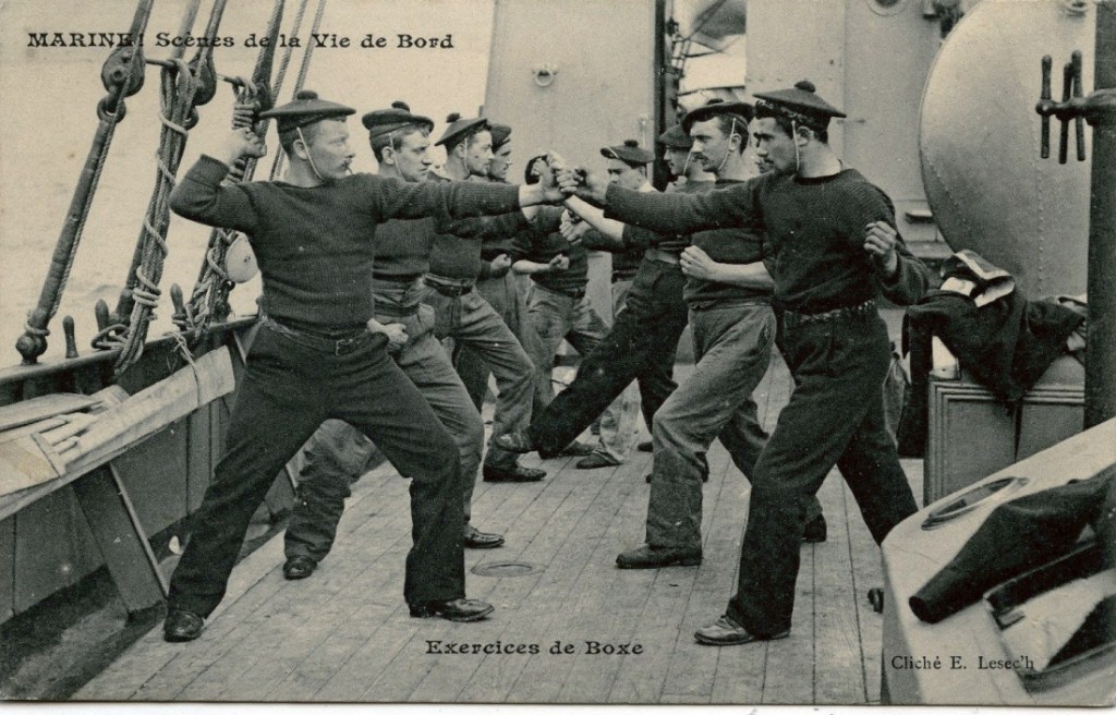 En introduction, pour vous mettre en appétit, ces quelques images du chausson militaire pratiqué par les marins qui servit de matrice à la Boxe Française que nous connaissons aujourd’hui.